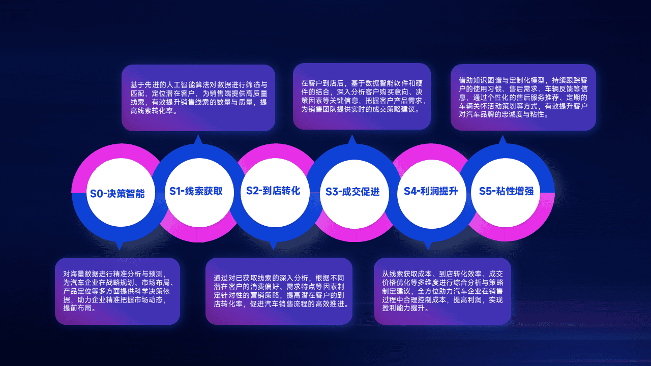 基于销售转化漏斗的薄弱环节,,,为客户提供数据+模型+运营的智能应用,,,,实现销售业绩的提升;推动线索管理全链路的精细化管理和运营。。